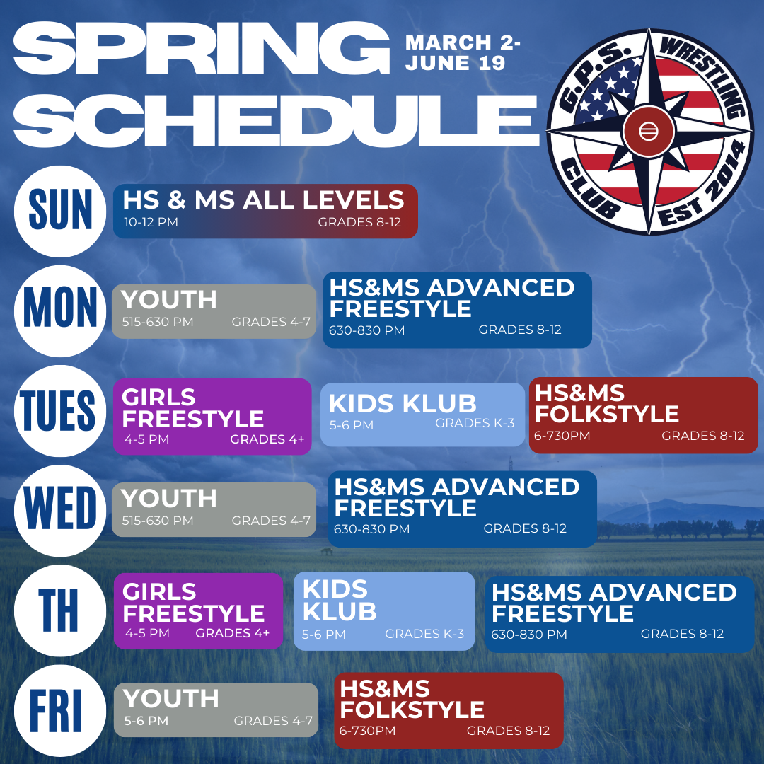grades 8-12 advanced freestyle | grades 8-12 folkstyle | KIDS KLUB GRADES K-3 | YOUTH GRADES 4-7 | GIRLS FREESTYLE | ONE DAY PASSES | ANNUAL PASSES |
